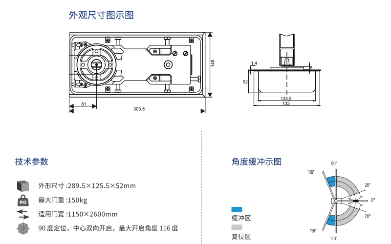 90 度定位,中心雙向開啟,最大開啟角度 116度