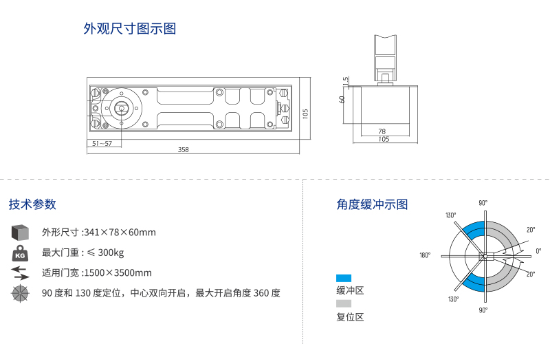 90 度和 130 度定位,中心雙向開啟,最大開啟角度 360度
